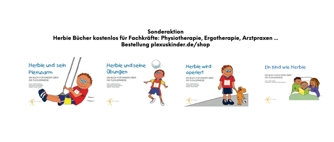 Die Sonderaktion endet am 30.04.2023. Sie können weiterhin die vier Herbie Bücher für €12 inkl. Versand, die Bücher: Herbie und sein Plexusarm, Herbie wird operiert und Herbie und seine Übungen einzeln für je € 4 plus €2 Versand und Ein Kind wie Herbie kostenlos anfordern.